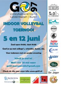 Ook dit jaar organiseert GO’97 weer een Indoor Volleybal Toernooi als afsluiting van het volleybalseizoen. Tijdens het GO’97 Indoor Volleybal Toernooi nemen teams van ervaren en minder ervaren volleyballers het twee avonden lang tegen elkaar op. Sportiviteit staat voorop, meedoen is belangrijker dan winnen. De toernooi-avonden zijn dit jaar op 5 en 12 juni en vinden plaats in de Randhorst in Geldermalsen. De inschrijfkosten bedragen 40 euro per team.